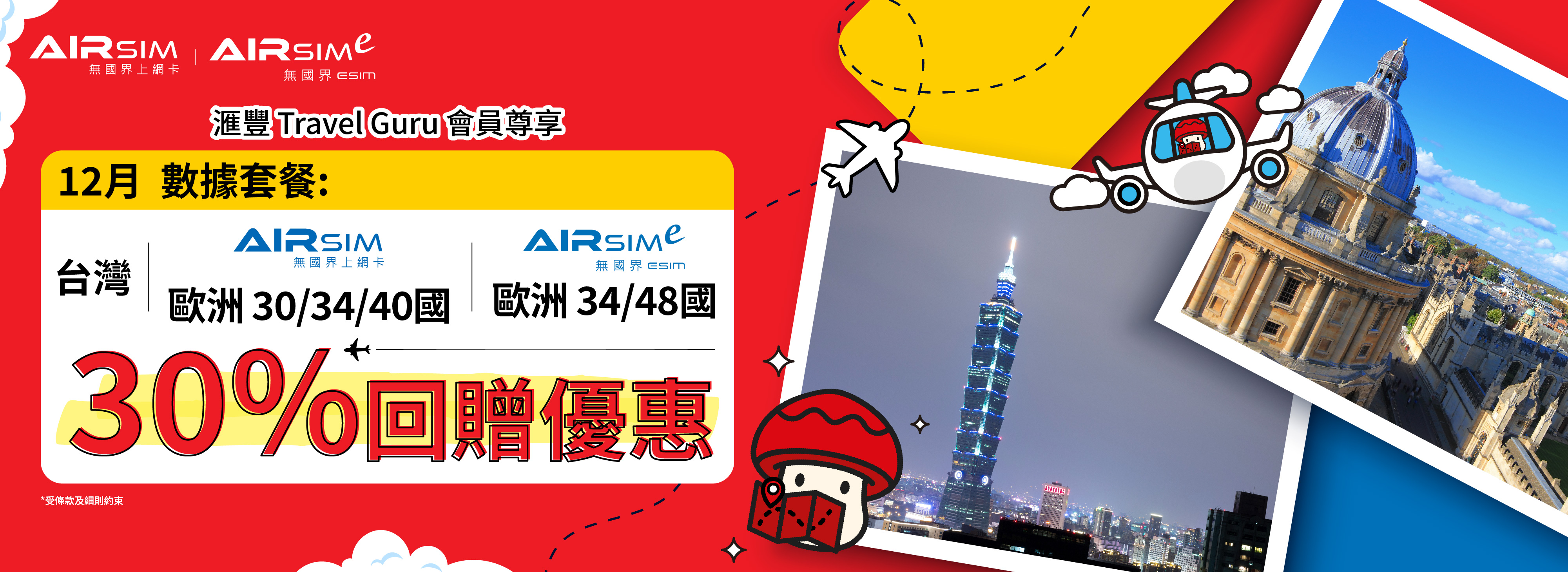 - 於 2025年 10 月3日起逢星期五以合資格滙豐信用卡於 AIRSIM / AIRSIMe 網頁或手機 App購買任何中國數據套餐,並於付款頁面輸入優惠代碼,即可獲該產品結帳付款金額 (其他推廣優惠的免費儲值額不計算在內) 之 30% 回贈。